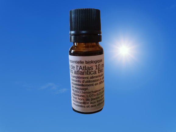 Huile essentielle biologique de cèdre de l’Atlas dans un flacon ambré avec compte gouttes inviolable. On utilise le bois pour la distillation.